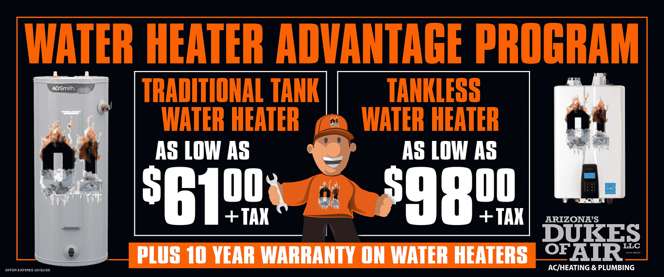 Arizona’s Dukes of Air is committed to providing exceptional plumbing special offers to customers in Mesa, Gilbert, and the East Valley. With a dedication to excellence and customer satisfaction, we take pride in being a trusted partner for your plumbing needs. Whether it’s a simple repair or a complex installation, we are here to help. Our team brings over 25 years of industry experience and combines expert knowledge with personalized service. We aim to ensure your home’s comfort with dependable solutions tailored to your needs. Trust us to deliver top-tier service that guarantees peace of mind and long-lasting results..